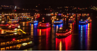 Watch a flotilla of illuminated boats make a dramatic arrival