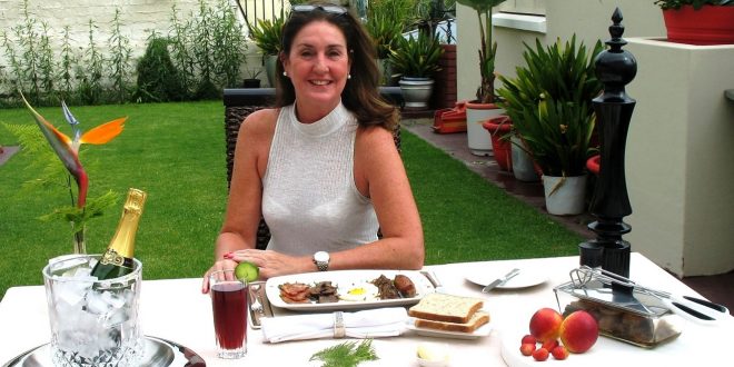 Jane Jones, co-owner of www.capedreams.co.za and sectional title specialist agent on the Atlantic Seaboard was served a birthday breakfast in the garden by www.capedreams.co.za editor Herman R Gibbs.