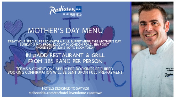 CAPE TOWN, April 19 – Mother’s Day will be celebrated in gourmet style at the luxurious Radisson Blu Le Vendome Hotel in Sea Point on Sunday, 8 May 2016, from 12pm with a special buffet menu to treat Moms, devised by Executive chef, Craig Carmichael.
